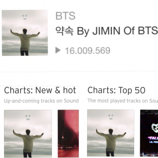 Jimin's self-produced solo song "Promise" has surpassed 16 million streams since its release on the 31st and is running without stopping toward 20 million. Jimin's solo song is not only breaking its own record for the fastest time and highest record among BTS songs on SoundCloud, but is also receiving explosive responses from around the world, currently taking first place Worldwide and in the Top 50.