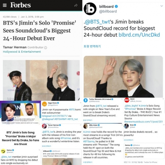 The overseas media response was also hot. On January 3rd (local time), the American business magazine Forbes reported on the global popularity of Jimin's solo song with an article titled, "BTS Jimin's solo song 'Promise' debuted with the highest record in 24 hours on the music sharing platform SoundCloud. US' Elite Daily also reported, "Jimin's solo song broke a major record set by Drake." A British media reporter expressed surprise, saying, "Jimin's power," and numerous overseas media outlets rushed to report on Jimin's new record. In addition, on the morning of the 5th, #IPromiseJimin rose to 2nd place on the real-time US and worldwide trends. '#RecordBreakingPromise' also rose to 3rd place in US and 7th place worldwide, showing the ongoing global response to Jimin's solo song.