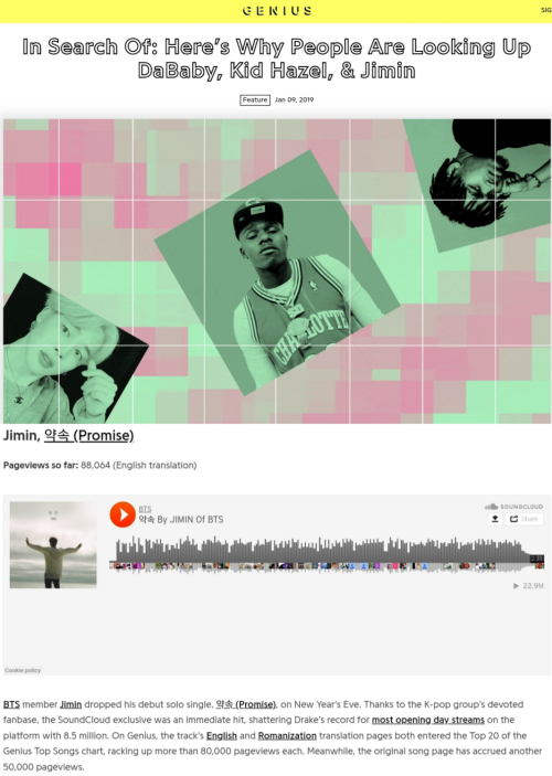 Genius mentioned Jimin's great achievement, saying, "BTS member Jimin released his solo debut song 'Promise' on New Year's Eve. Thanks to passionate K-pop fans, SoundCloud became a huge hit, and 'Promise' broke the record of 8.5 million streams, breaking pop star Drake's record for the most streams in a single day.